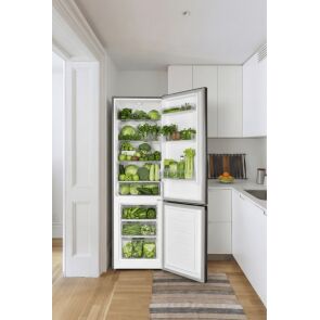 Kernau KFRC 18153 IX to stylowa chłodziarko-zamrażarka inox o wysokości 180 cm i pojemności 262 l, idealna do nowoczesnych kuchni. Elektroniczne sterowanie, funkcja Super Freeze, alarm otwartych drzwi i LED-owe oświetlenie zapewniają wygodę i bezpieczeństwo. Dzięki możliwości przełożenia drzwi oraz kompaktowym wymiarom, dopasujesz ją do każdego wnętrza. Klasa energetyczna E i niski poziom hałasu (40 dB) to komfort i oszczędność każdego dnia.