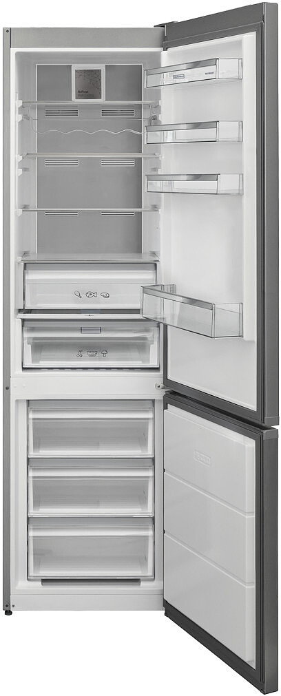 Zaletą tego modelu jest dyskretna praca. Odgłos, który generuje, jest podobny do szumu w domu, co sprawia, że urządzenie nie będzie Ci przeszkadzać w wykonywaniu codziennych obowiązków. W komorze chłodzenia producent zastosował system No Frost, który zapewnia prawidłową cyrkulację powietrza i utrzymuje niski poziom wilgoci. Ta technologia sprawia, że na ścianach części chłodzącej nie osadza się szron ani lód, co całkowicie zwalnia z konieczności ręcznego rozmrażania. W lodówce zastosowano sterowanie elektroniczne. Taki rodzaj sterowania jest łatwy w obsłudze i pozwala na dokładne ustawienie temperatury w komorze chłodzenia lub w komorze mrożenia. Producent zastosował w lodówce oświetlenie LED, które cechuje się bardzo wysoką energooszczędnością i długą żywotnością. To zapewnia niższe koszty eksploatacyjne lodówki. LED-y doskonale oświetlają półki w lodówce, dzięki czemu będziesz mógł sięgnąć po jedzenie, bez włączania górnego źródła światła w pomieszczeniu kuchennym.