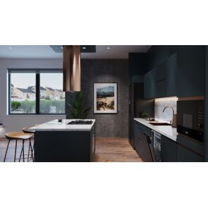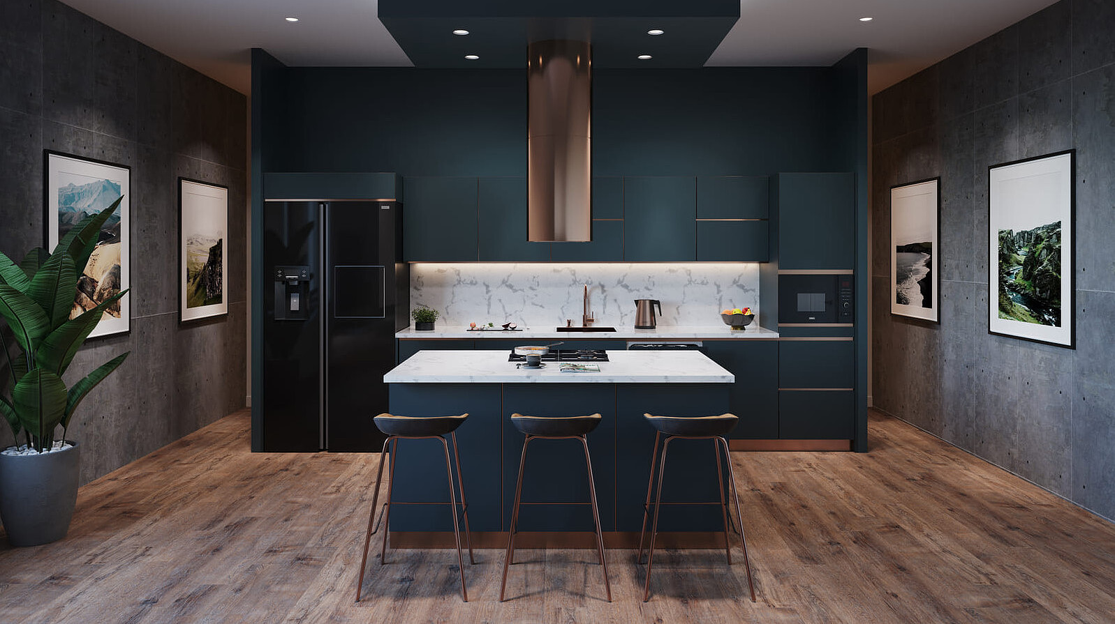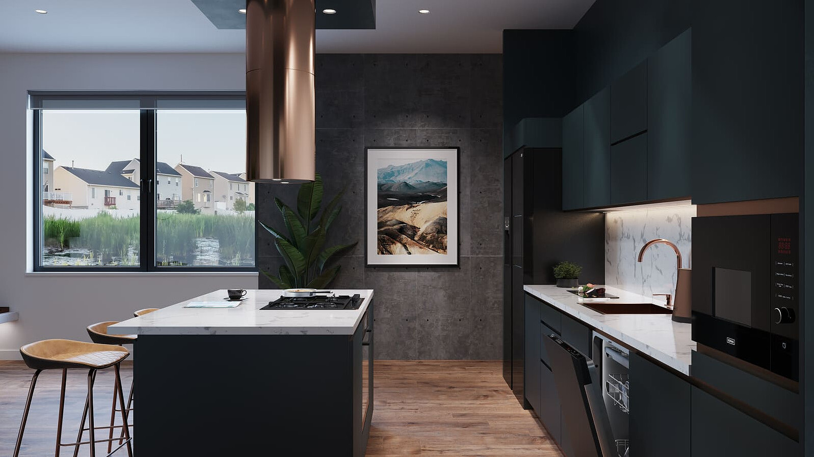 Miedziany okap KCH 0440.1 Copper Island typu tuba o wydajności 767 m3/h z rekulacją wysokości sterowany przyciskami Soft Touch. Urządzenie niezwykle sprawnie usuwa parę i zapachy powstające podczas gotowania. Nawet w tak dużym pomieszczeniu jak kuchnia połączona z salonem. Kuchnia otwarta na salon z wyspą, dzielącą strefę wypoczynkową od strefy gotowania, to modne i coraz częściej wybierane rozwiązanie. Warto jednak wyposażyć ją w dobry okap wyspowy, aby uniknąć przesiąkniętych kuchennymi zapachami firan, zasłon i tapicerowanych mebli.