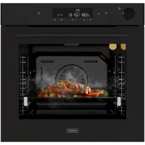 Opcje piekarnika są wskazywane poprzez sterowanie sensorowe. Zamiast zwykłych pokręteł przewidziano tutaj panel reagujący na dotyk. Wystarczy delikatne naciśnięcie odpowiedniego pola, żeby aktywować funkcje urządzenia. Jeśli zechcesz wyczyścić środek piekarnika, wystarczy że wlejesz odrobinę wody do odpowiedniego pojemnika i aktywujesz opcję czyszczenia parowego. Pod wpływem wysokiej temperatury woda ulotni się w parę wodną, która efektywnie zmiękczy zabrudzenia, co w znacznym stopniu ułatwi ich usunięcie ze ścianek. Umieszczone we wgłębieniach ścianek piekarnika prowadnice drabinkowe ułatwiają wsuwanie blach do komory pieczenia i wysuwanie ich. Co więcej, można je z łatwością rozebrać, by umyć środek piekarnika. Prowadnice są niezwykle ważne dla naszego bezpieczeństwa i wygody pracy. Z tego względu producent zamontował w tym modelu prowadnice teleskopowe, które umożliwiają komfortowe wysunięcie blachy jednym ruchem ręki. Poza tym takie prowadnice są stabilne i zachowują idealny poziom, więc nie ma ryzyka upuszczenia zawartości na podłogę i poparzenia sobie rąk.
