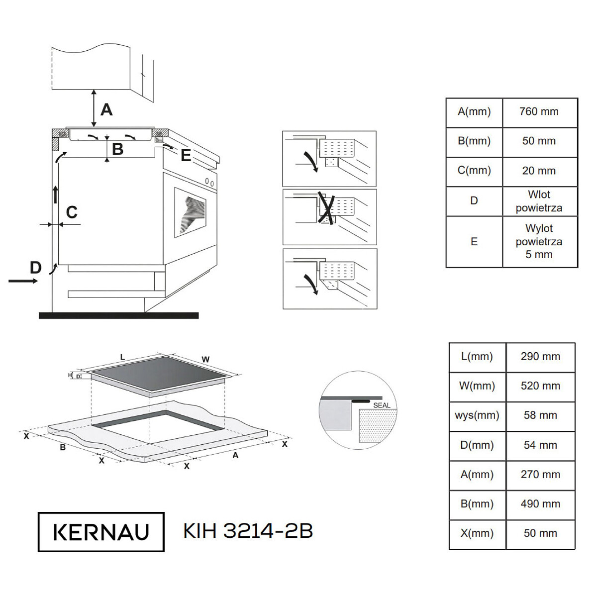 - Otwór montażowy (DxGxW) + szkło 4 mm: 270x 490 mm