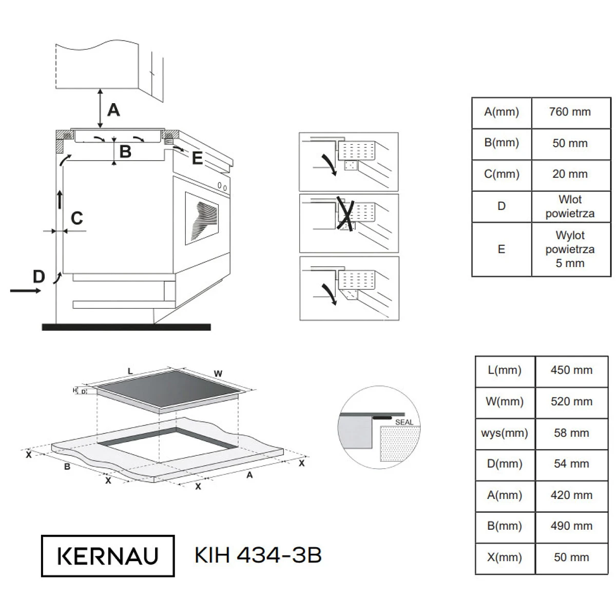 - Otwór montażowy (d x g x w) + szkło 4 mm: 420 x 490 mm