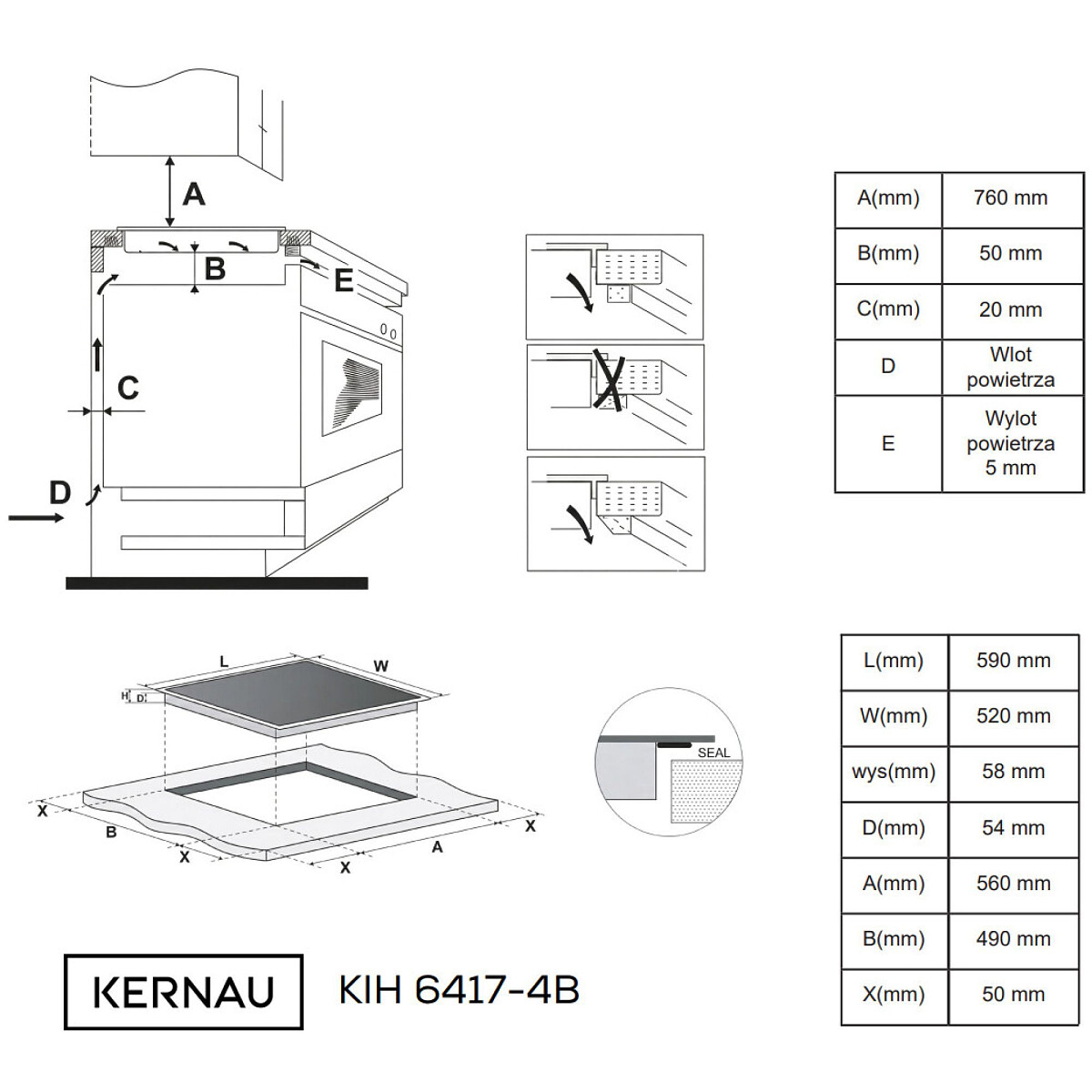 • Otwór montażowy (DxGxW) + szkło 4 mm: 560x 490 mm