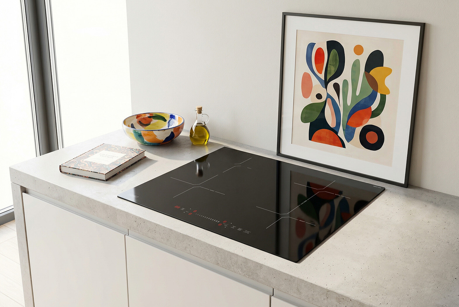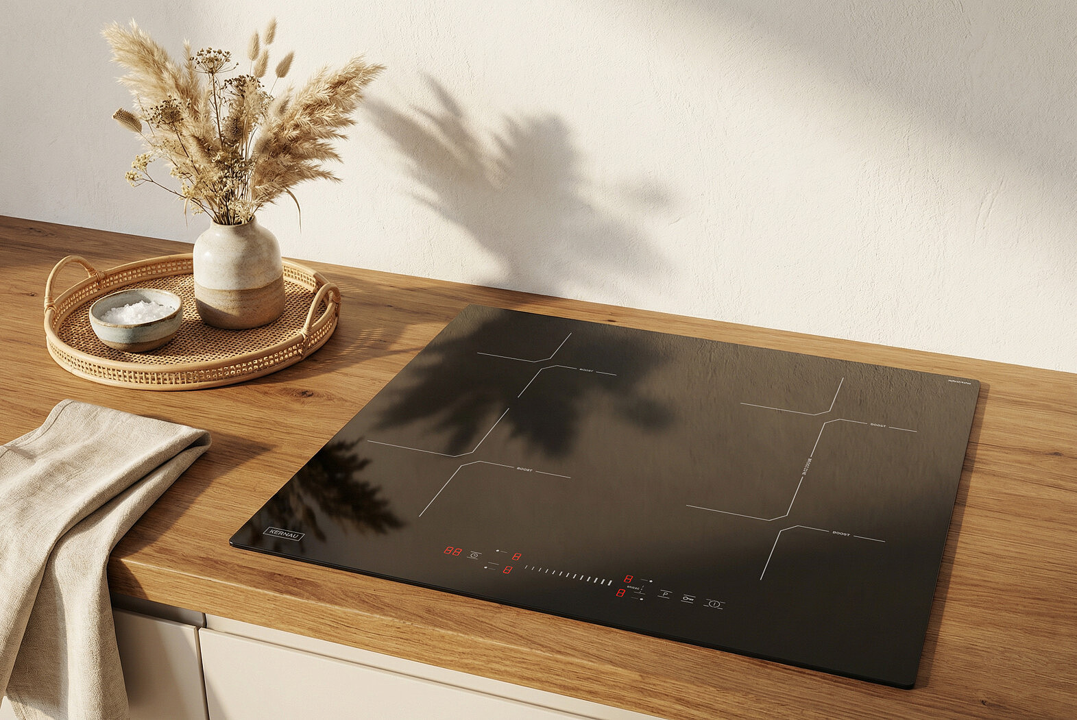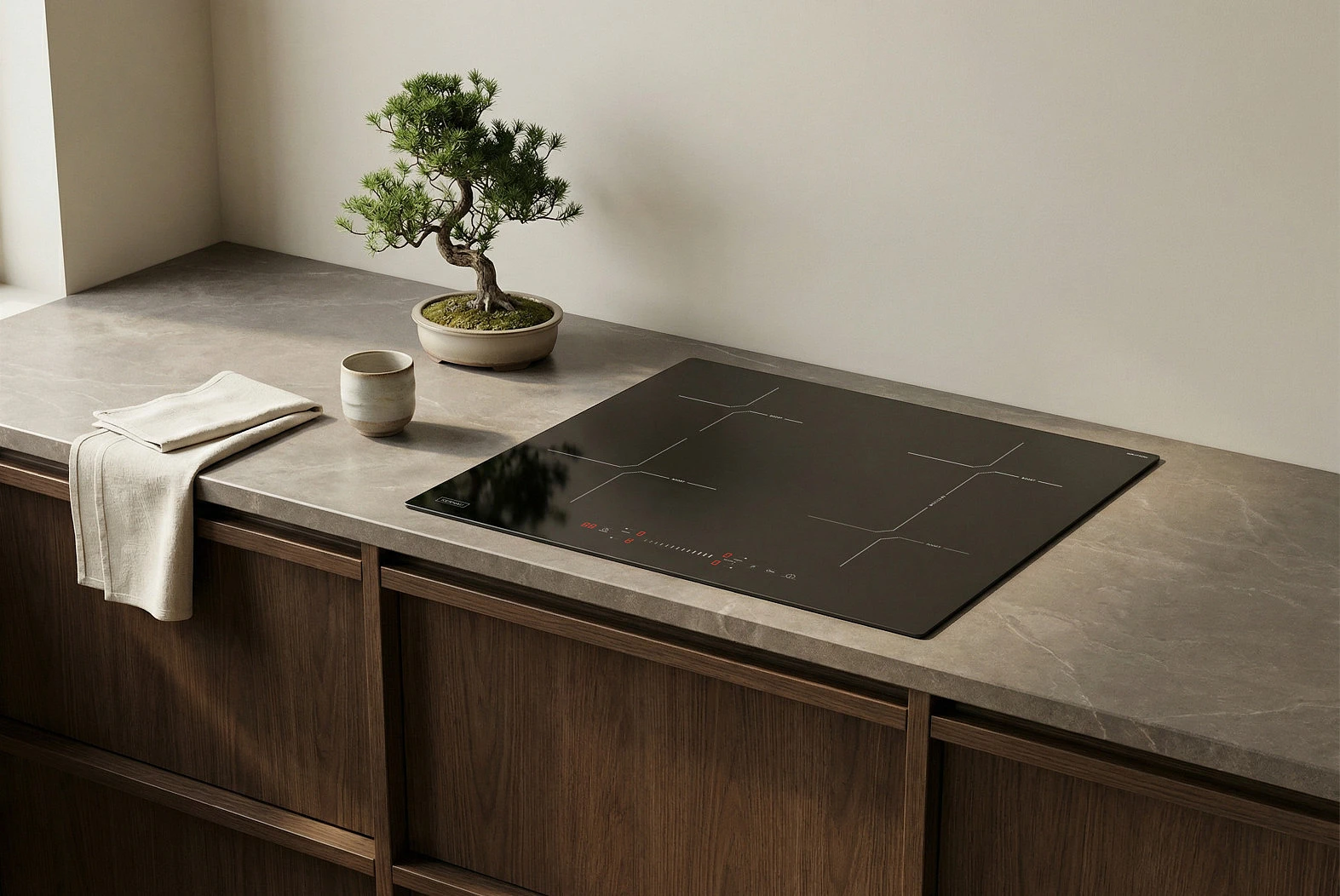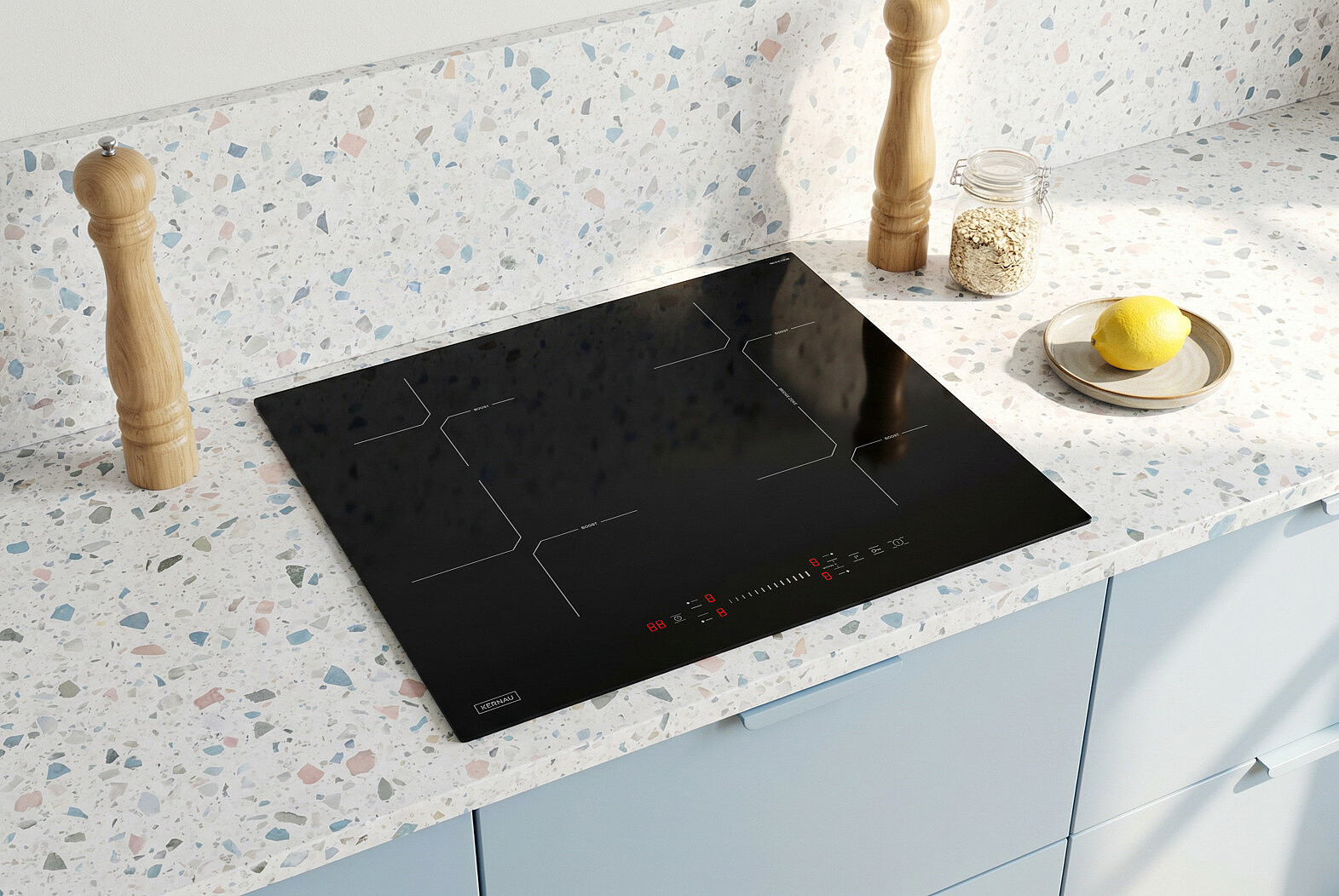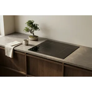 Detale tworzą charakter wnętrza. Krawędzie płyty zostały wykończone szlifem typu C, co nadaje jej miękki, opływowy profil. Brak ostrych rantów sprawia, że urządzenie optycznie stapia się z blatem, tworząc spójną, minimalistyczną całość. Taka konstrukcja to także ukłon w stronę funkcjonalności – gładkie brzegi są niezwykle łatwe do utrzymania w czystości.