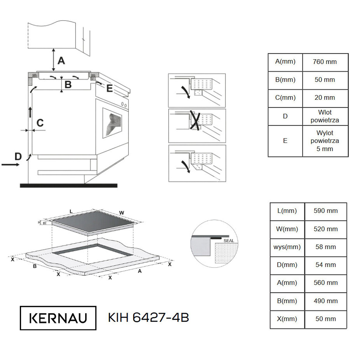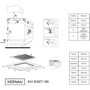 - Otwór montażowy (d x g x w) + szkło 4 mm: 560 x 490 mm