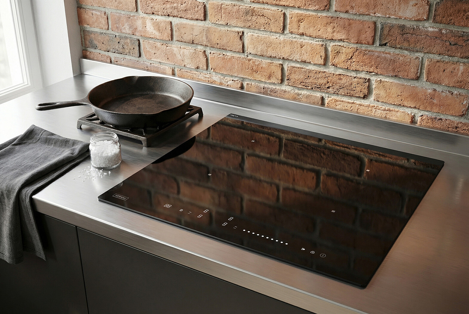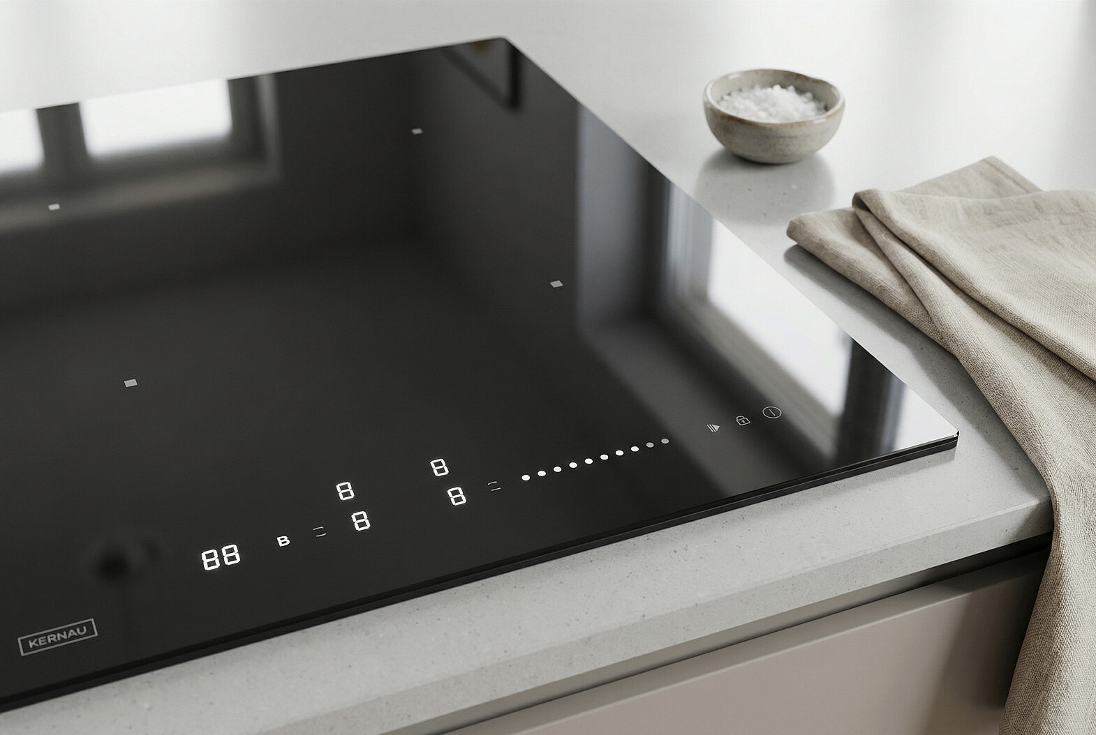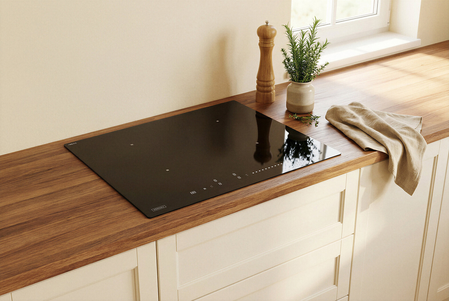 Detale mają znaczenie. W tym modelu klasyczna czerń ceramiki została przełamana subtelnymi, srebrnymi grafikami stref grzewczych i panelu sterowania. To estetyczny niuans, który nadaje kuchni lekkości i nowoczesnego sznytu, idealnie komponując się z metalicznymi dodatkami we wnętrzu. Całość dopełnia szlif typu C, który łagodzi krawędzie szkła, zapewniając bezpieczeństwo i łatwość czyszczenia.