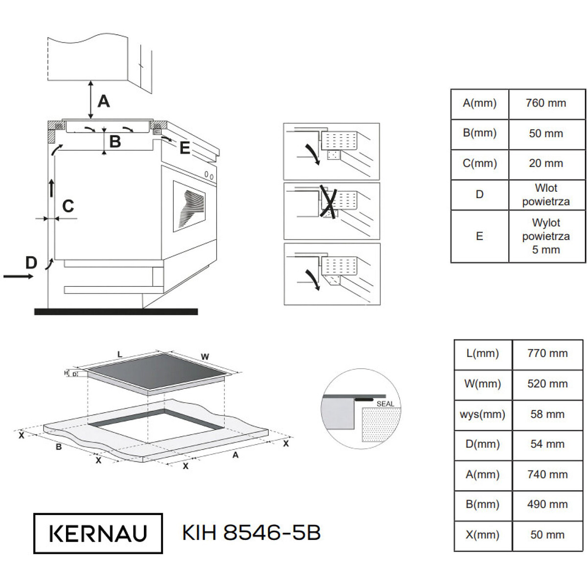 - Otwór montażowy (d x g x w) + szkło 4 mm: 740 x 490 mm