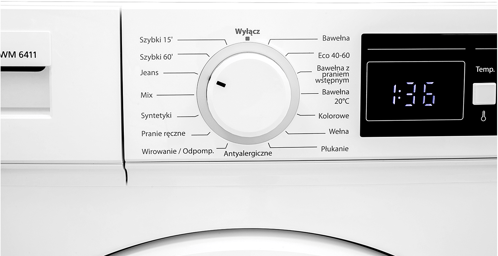 Rodzaje programówBawełna, Bawełna 20°, Bawełna+ pranie wstępne, Eco 40°C-60°C, Kolorowe, Wełna, Płukanie, Antyalergia, Syntetyki, Mix, Jeans/Ciemne kolory, Szybki 60', Szybki 15', Pranie ręczne, Wirowanie