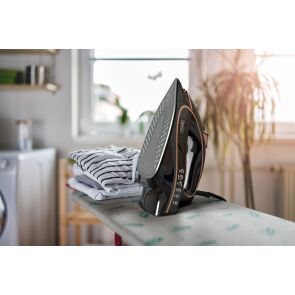 Produkt ma podstawę ceramiczną. Ten materiał jest obecnie naprawdę ceniony, bo ma dobre cechy. Gwarantuje doskonały poślizg na tekstyliach i jest niewrażliwy na uszkodzenia, np. od sprzączek. Wysoka moc sprawi, że żelazko nagrzeje się błyskawicznie, dzięki czemu bezzwłocznie będziesz mógł rozpocząć prasowanie tekstyliów. Korzystając z tego modelu, możesz prasować materiały z wykorzystaniem pary. Produkt generuje parę na optymalnym poziomie, co uprości prasowanie.