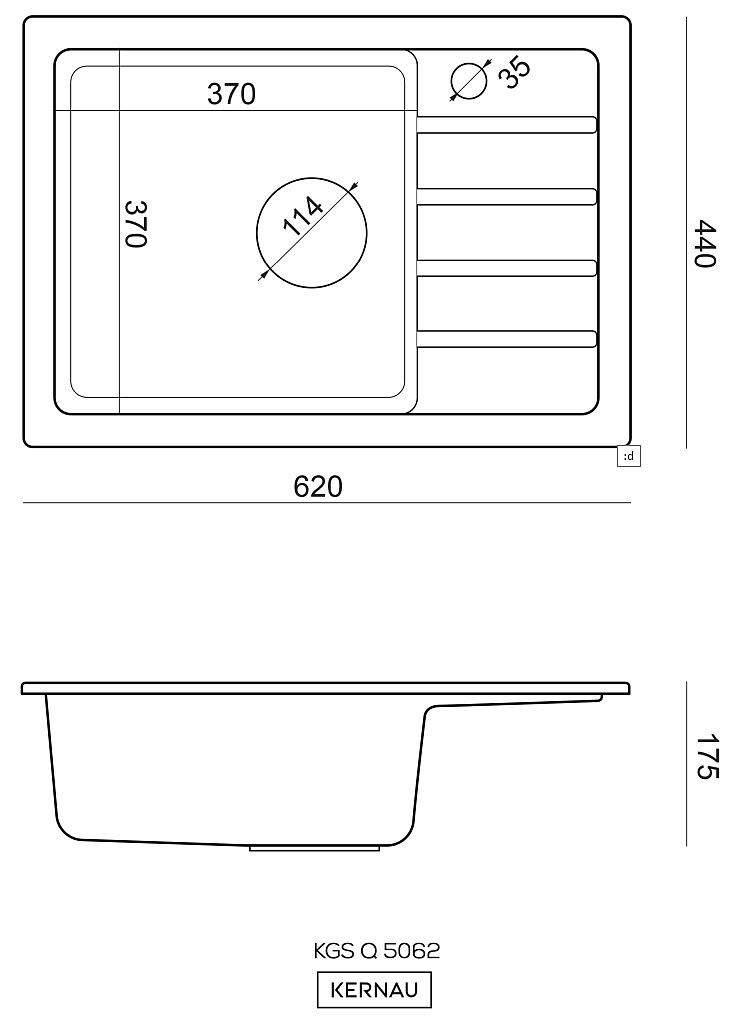 Model KGS Q to zlewozmywak przeznaczony do montażu na blacie kuchennym. Nakłada się go od góry na otwór w blacie. Dzięki swoim wymiarom pasuje do wielu modeli gotowych kuchni. Minimalna podbudowa szafki powinna wynosić 50 cm.
