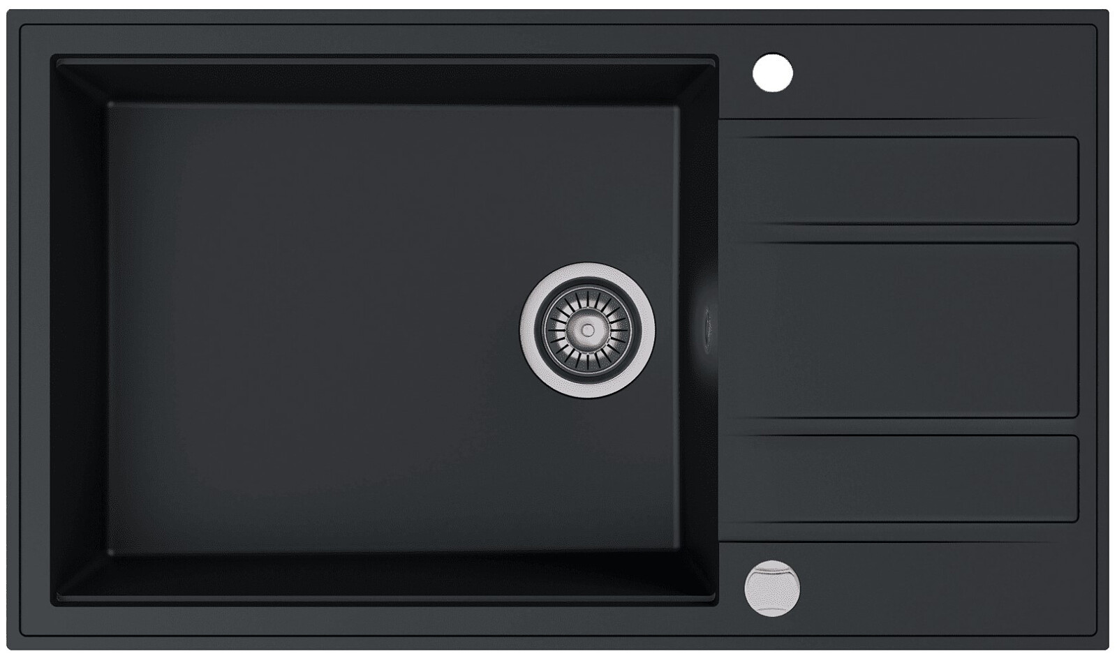 KGS N 6586 1B1D Deep Black został wyposażony w bardzo wygodny w użyciu korek pneumatyczny, który znajduje się na brzegu zlewu. Wystaczy nacisnąć przycisk, a odpływ zostanie zamknięty lub otwarty. Zlew jest przeznaczony do montażu nablatowego. Pasuje do szafki o minimalnej podbudowie 80 cm.