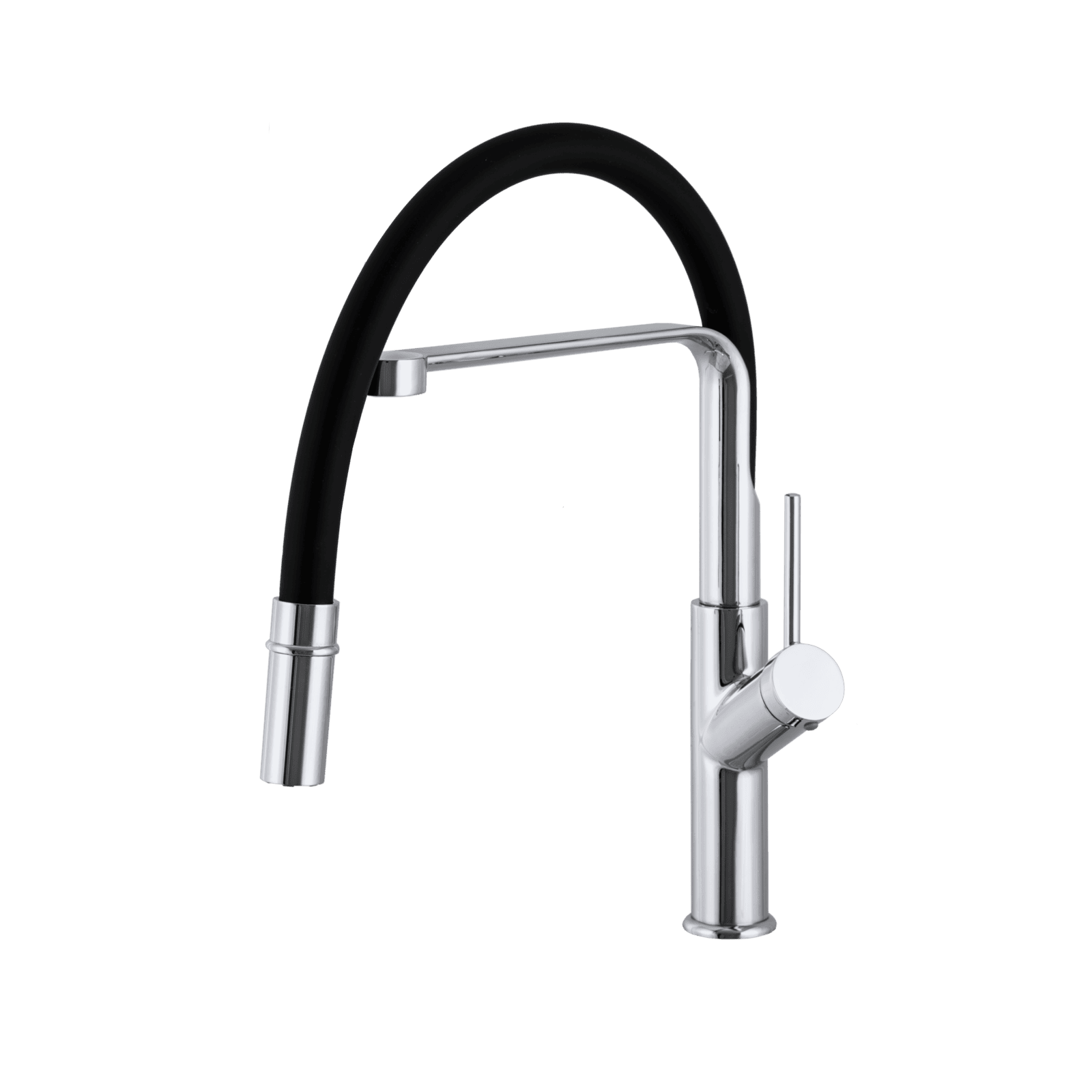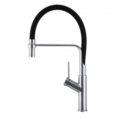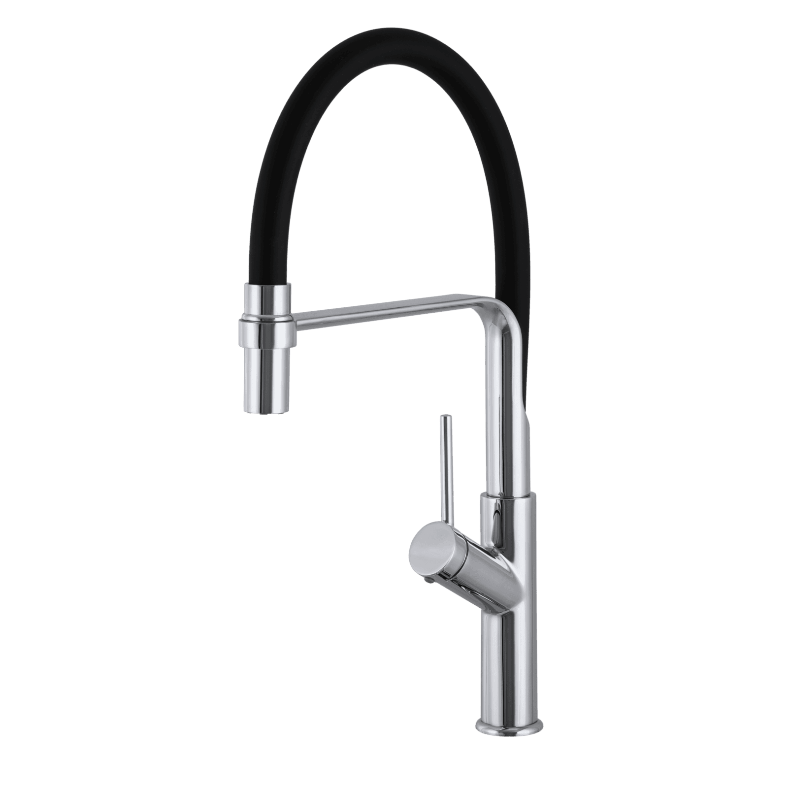 Bellis KWT 44 Chrome/Black to bateria kuchenna, która nie tylko dobrze wygląda, ale również precyzyjnie działa. Jej forma nawiązuje do baterii stosowanych w kuchniach profesjonalnych – prosta, funkcjonalna, oparta na metalowym ramieniu i gumowej, elastycznej wylewce, którą łatwo skierować tam, gdzie trzeba. Czarny mat i chrom tworzą wyrazisty kontrast, który świetnie wpisuje się w nowoczesne kuchnie z industrialnym zacięciem.