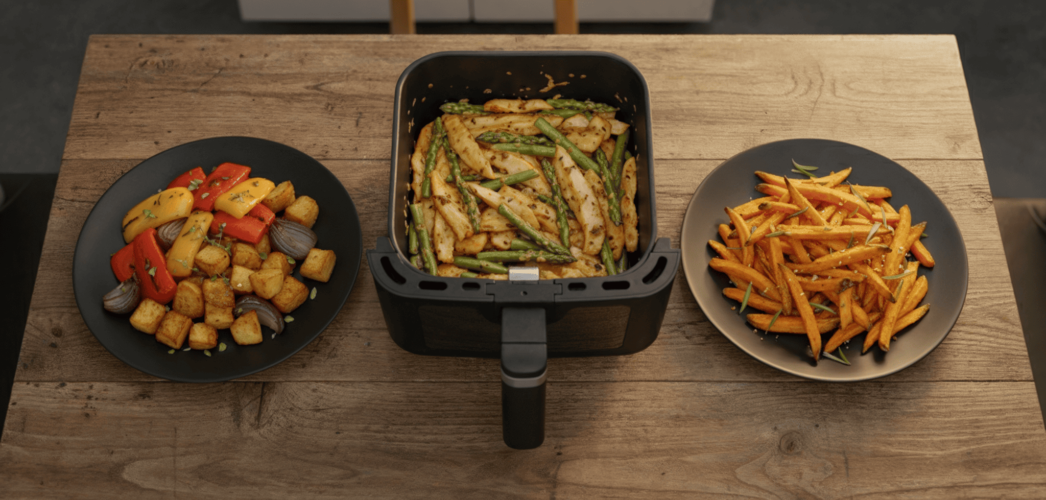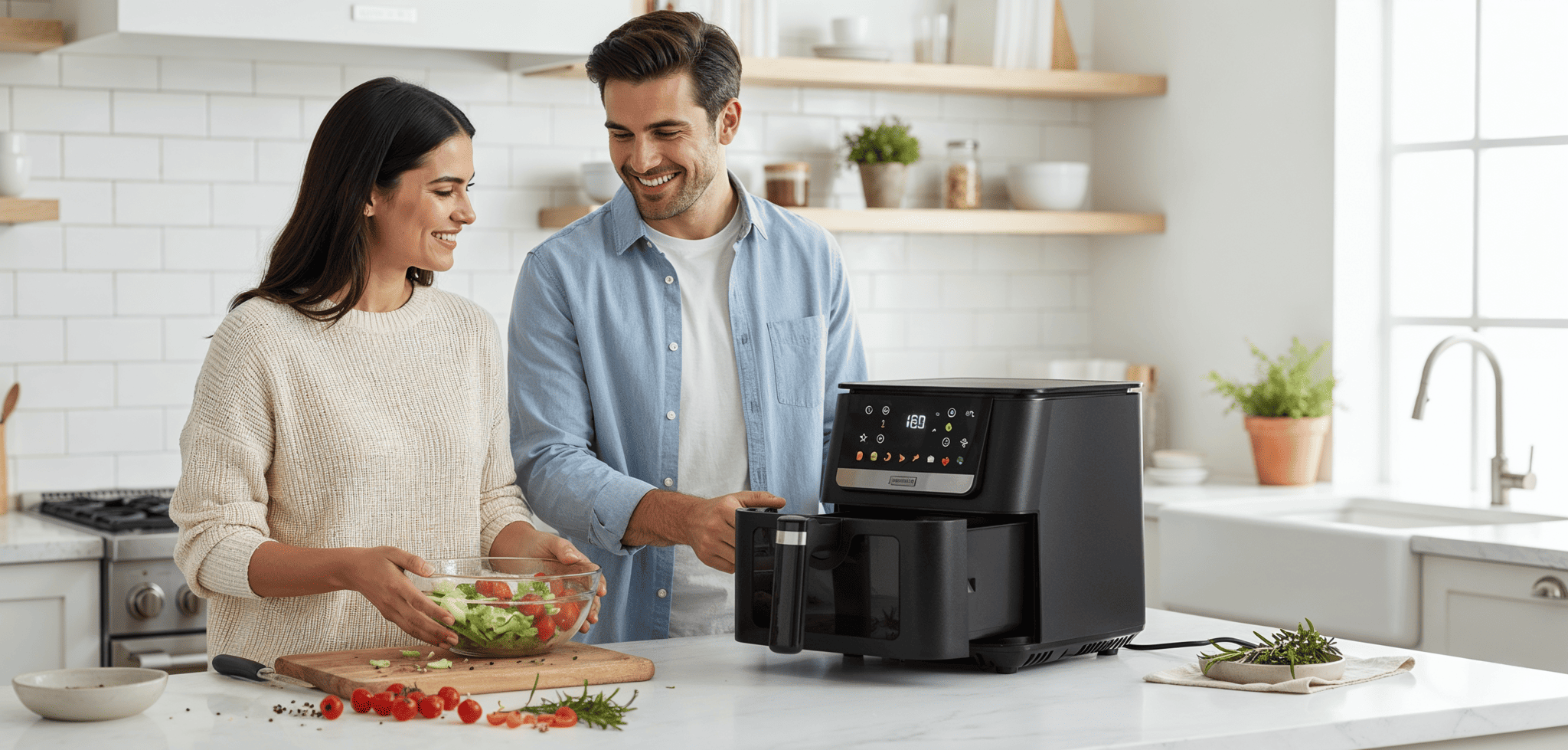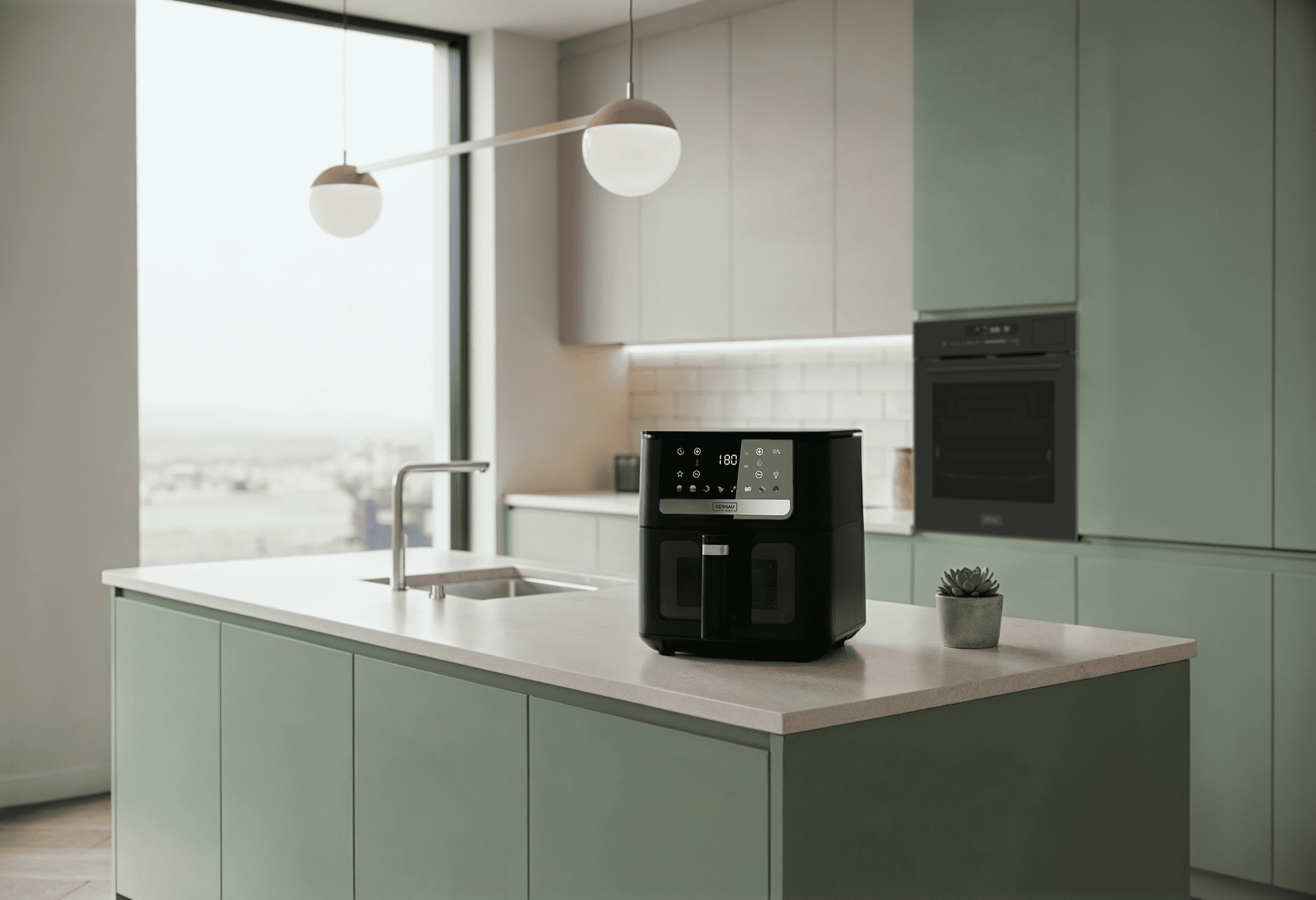 KERNAU BKSAF 617 EB to frytkownica beztłuszczowa z dużą pojemnością 6,5 l, stworzona z myślą o zdrowym stylu życia i wygodzie codziennego gotowania. Dzięki innowacyjnej technologii dynamicznego obiegu powietrza, przygotujesz chrupiące dania bez użycia oleju – szybko, łatwo i bez kompromisów.
