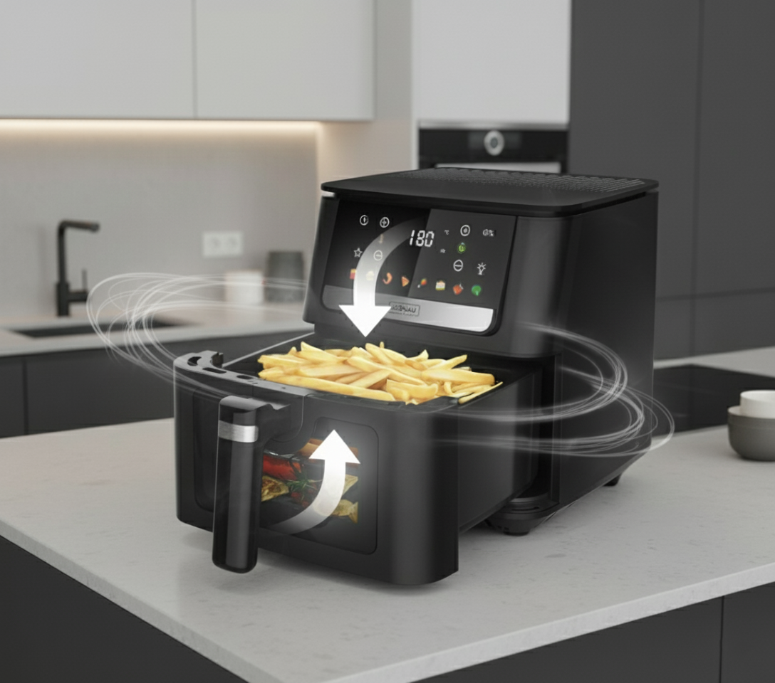 W sercu urządzenia znajduje się wydajny system cyrkulacji gorącego powietrza, który równomiernie rozprowadza ciepło, eliminując potrzebę smażenia w tłuszczu. Dzięki regulacji temperatury od 40°C do 200°C, dostosujesz tryb pracy do każdego dania – od delikatnego podgrzewania po intensywne pieczenie. Moc 1700 W gwarantuje szybkie nagrzewanie, a funkcja wstępnego podgrzewania kosza pozwala osiągnąć perfekcyjne efekty za każdym razem.
