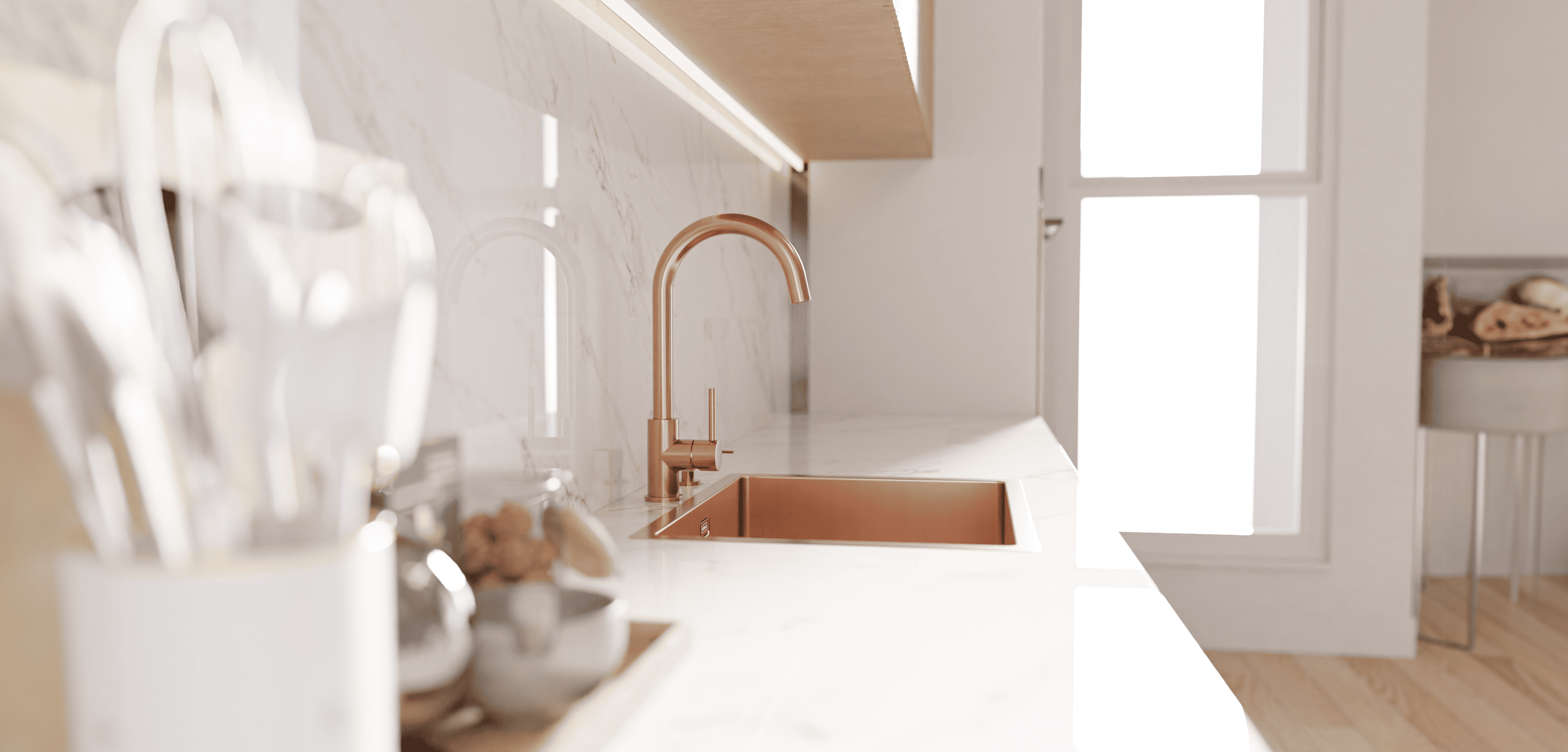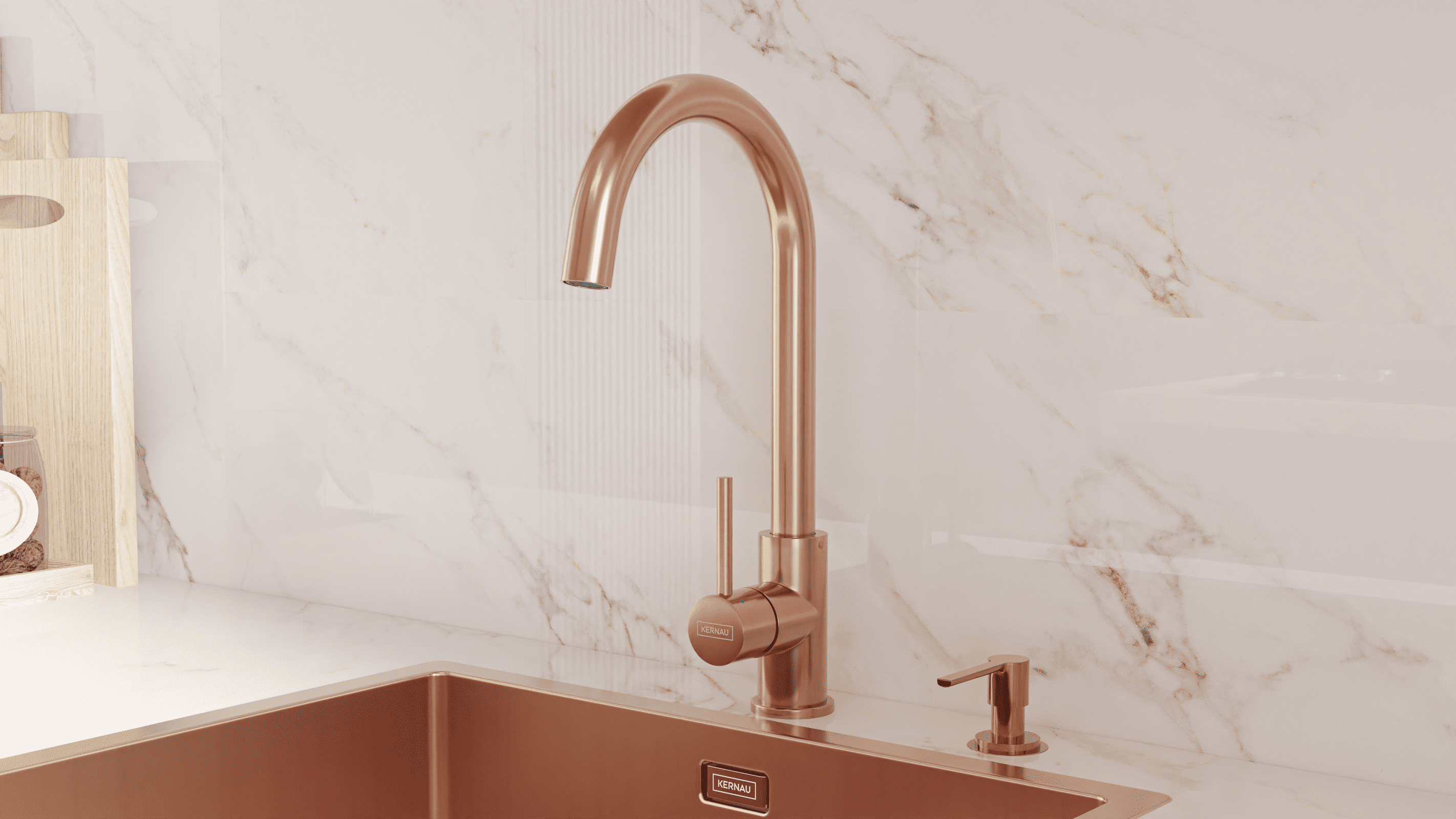 Bateria KWT 27 Copper wyposażona w perlator, obrotową stałą wylewkę. To bateria o unikalnej miedzianej barwie. Będzie ciekawym dopełnieniem zlewu i z pewnością zwróci uwagę. To produkt, obok którego nie można przejść obojętnie. Powłoka, którą została pokryta ta bateria charakteryzuje się odpornością na wszelkie uszkodzenia mechaniczne czy chemiczne. Bateria posiada obrotową wylewkę, co znacznie usprawnia płukanie naczyń. Obecny w baterii perlator pozwoli na dokładne spłukiwanie naczyń i zapobiegnie pojawianiu się zacieków na ściankach zlewozmywaka oraz naczyniach. Głowica ceramiczna daje możliwość precyzyjnego regulowania strumienia wody i jej temperatury. Bateria posiada również system odkamieniania, który zapobiega powstawaniu trudnego do usunięcia osadu z kamienia.
