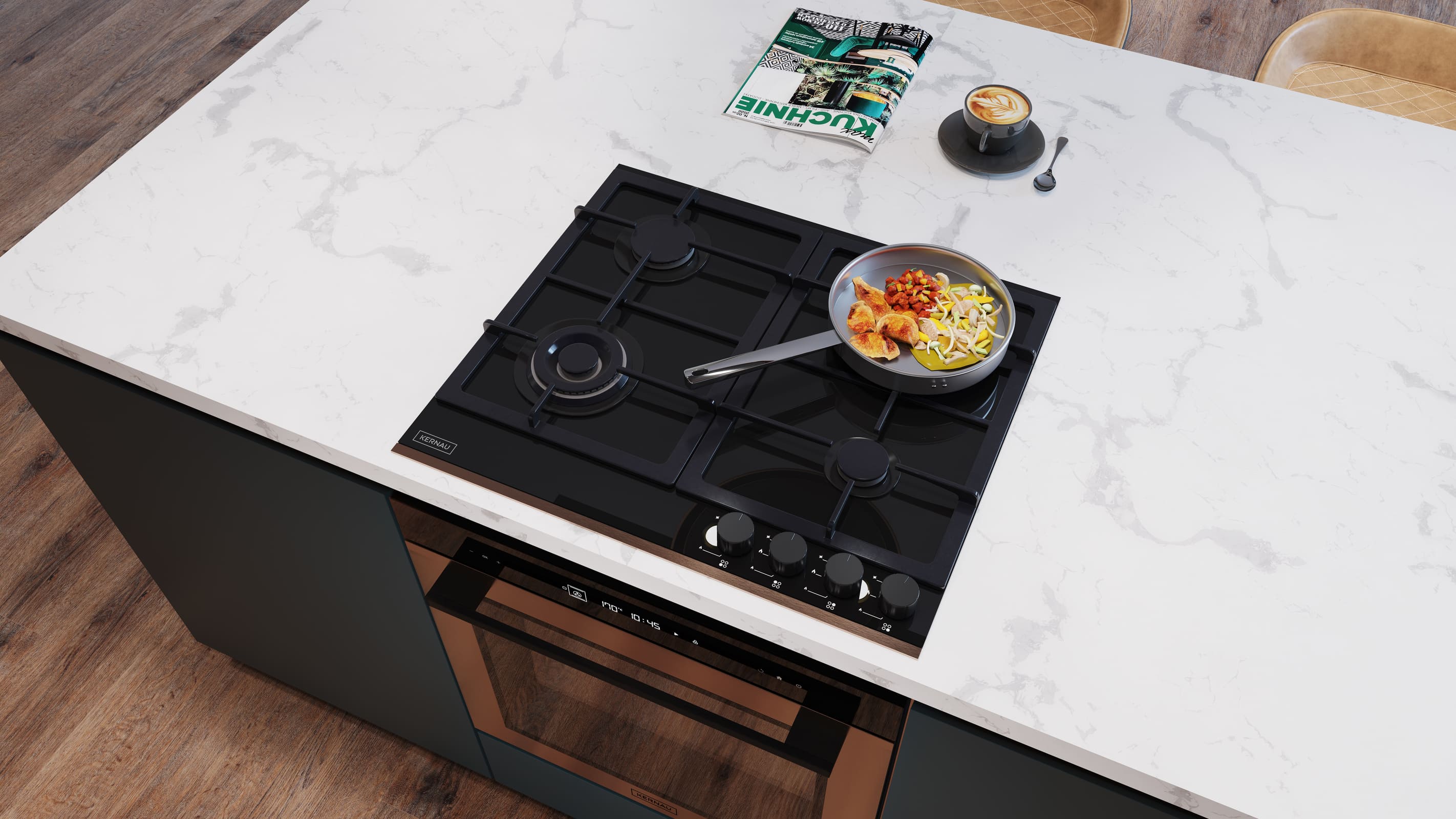 Płyta gazowa KGH 6464 Copper to naprawdę dobry sprzęt, który sprawdzi się u każdego amatora kuchni. Swoją niezawodność i trwałość zawdzięcza powierzchni z czarnego szkła hartowanego i żeliwnym rusztom. Ciekawym elementem zastosowanym tutaj jest listwa w kolorze Copper. Ten z pozoru niewielki miedziany akcent sprawia, że kuchenna przestrzeń wyróżnia się spośród miliona podobnych do siebie kuchni.