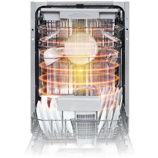 System suszenia Turbo przyspiesza proces osuszania naczyń, eliminując konieczność ręcznego wycierania. Dzięki temu naczynia są gotowe do użycia zaraz po zakończeniu cyklu.