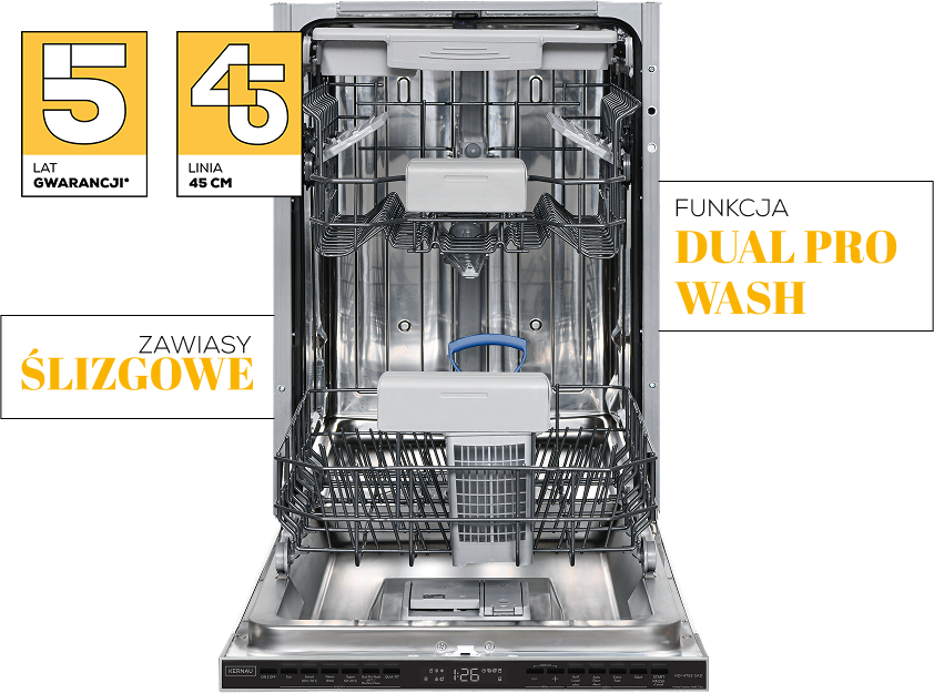 Funkcja Dual Pro Wash umożliwia jednoczesne zmywanie delikatnych naczyń w górnym koszu oraz mocno zabrudzonych garnków w dolnym, gwarantując idealne efekty mycia przy jednym cyklu. To praktyczne rozwiązanie, które oszczędza czas i wodę.