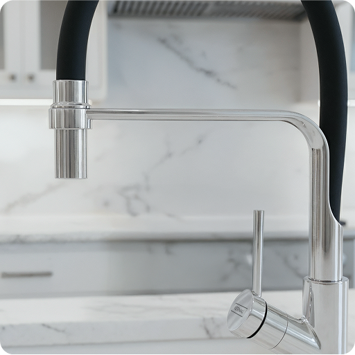 Stabilny uchwyt zamocowany przy korpusie baterii pełni funkcję wygodnej podpory dla końcówki elastycznej wylewki. Dzięki niemu wylewka zawsze wraca na swoje miejsce i pozostaje estetycznie ustawiona, bez konieczności każdorazowego poprawiania jej po użyciu.
